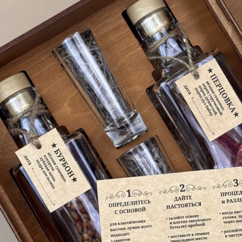 - Состав:стеклянные бутылки 0,5 л - 2 шт со специями ( перцовка, бурбон), 2 стопки, рецепт приготовления