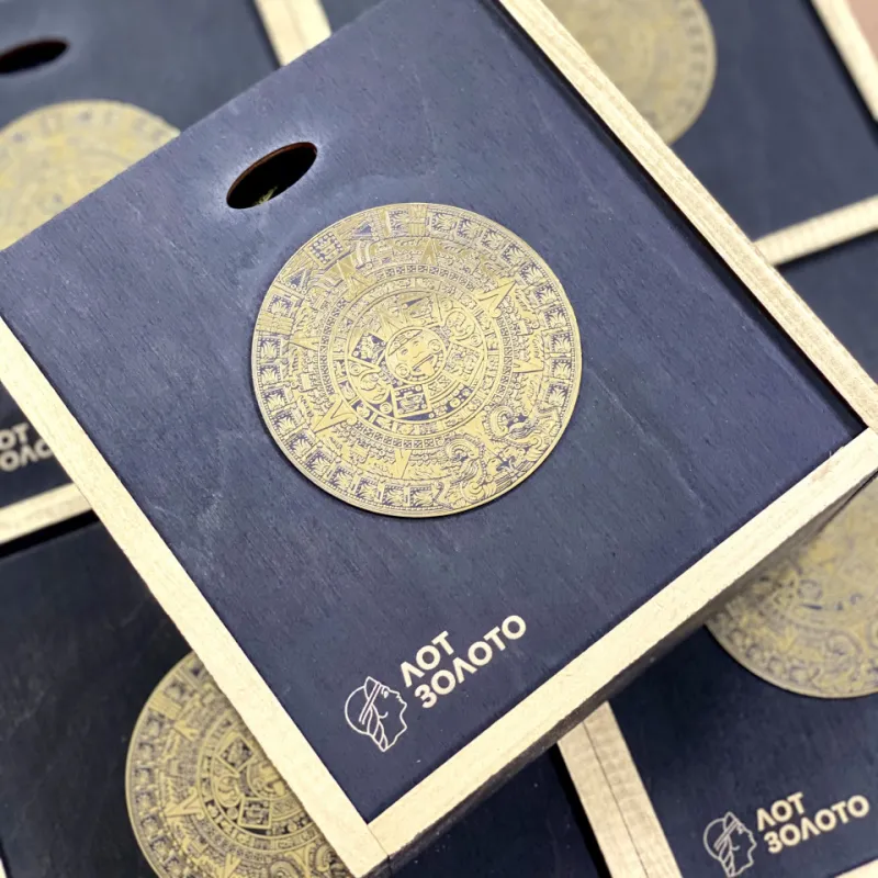 - Упаковка:деревянная коробка-пенал из сосны с покраской в два цвета, шильда "календарь ацтеков" из зеркального пластика, наполнитель