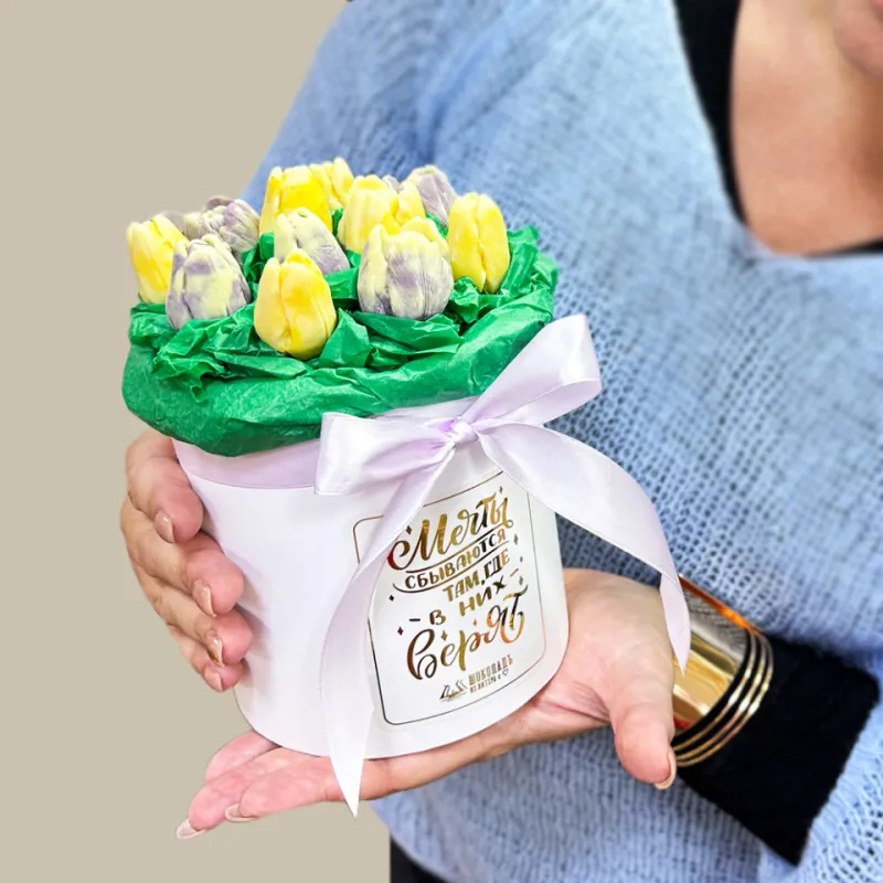 Шоколадные тюльпаны 11 шт в круглой коробке, белый шоколад