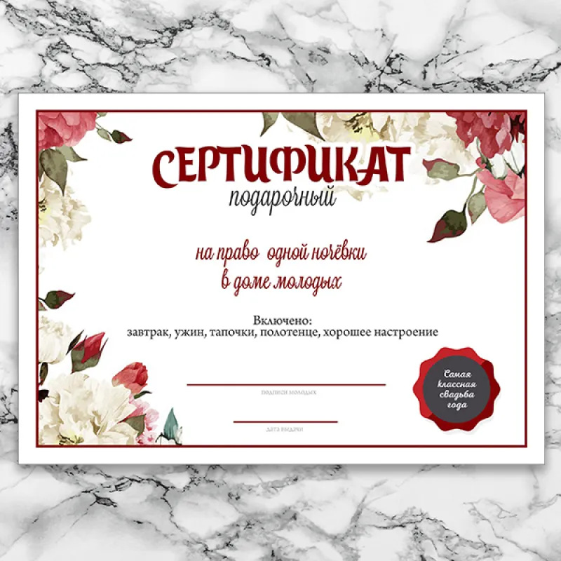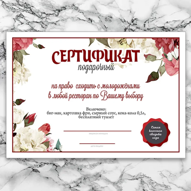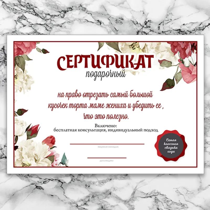Комплект шуточных сертификатов "Пионы Марсала" (готовый дизайн)