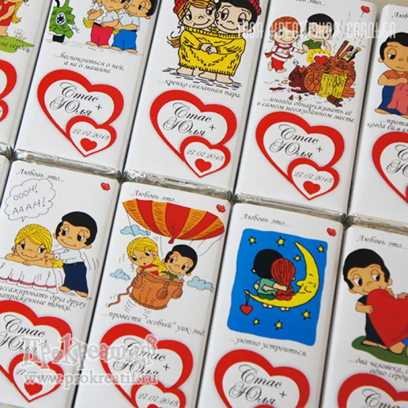 В заказе до 100 штук шоколадки будут все с разными картинками на лицевой стороне, что, непременно, позабавит гостей.