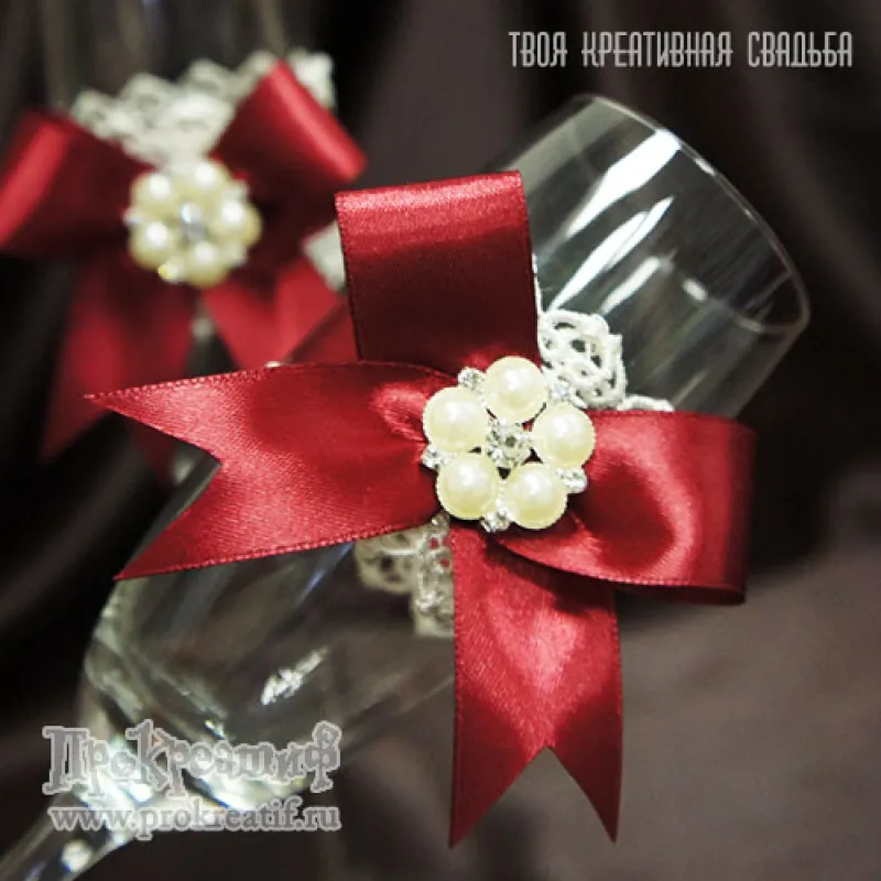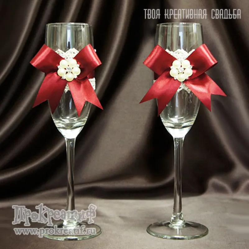 Бокалы могут быть декорированы в соответствии со стилем Вашего торжества и в любом цветовом решении.